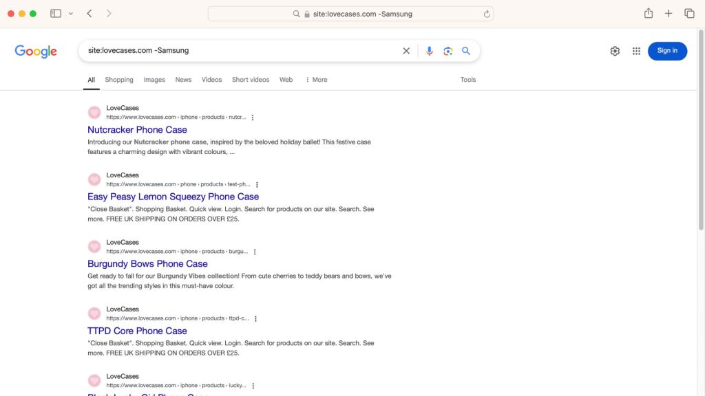 Another example could be you wanting to improve the SEO of your website. You can first use something like site:lovecases.com to search the site in question, then intitle:”best phone case” to view what product pages have optimised title tags. This will help you identify what tags can be improved and boost your search engine rankings.